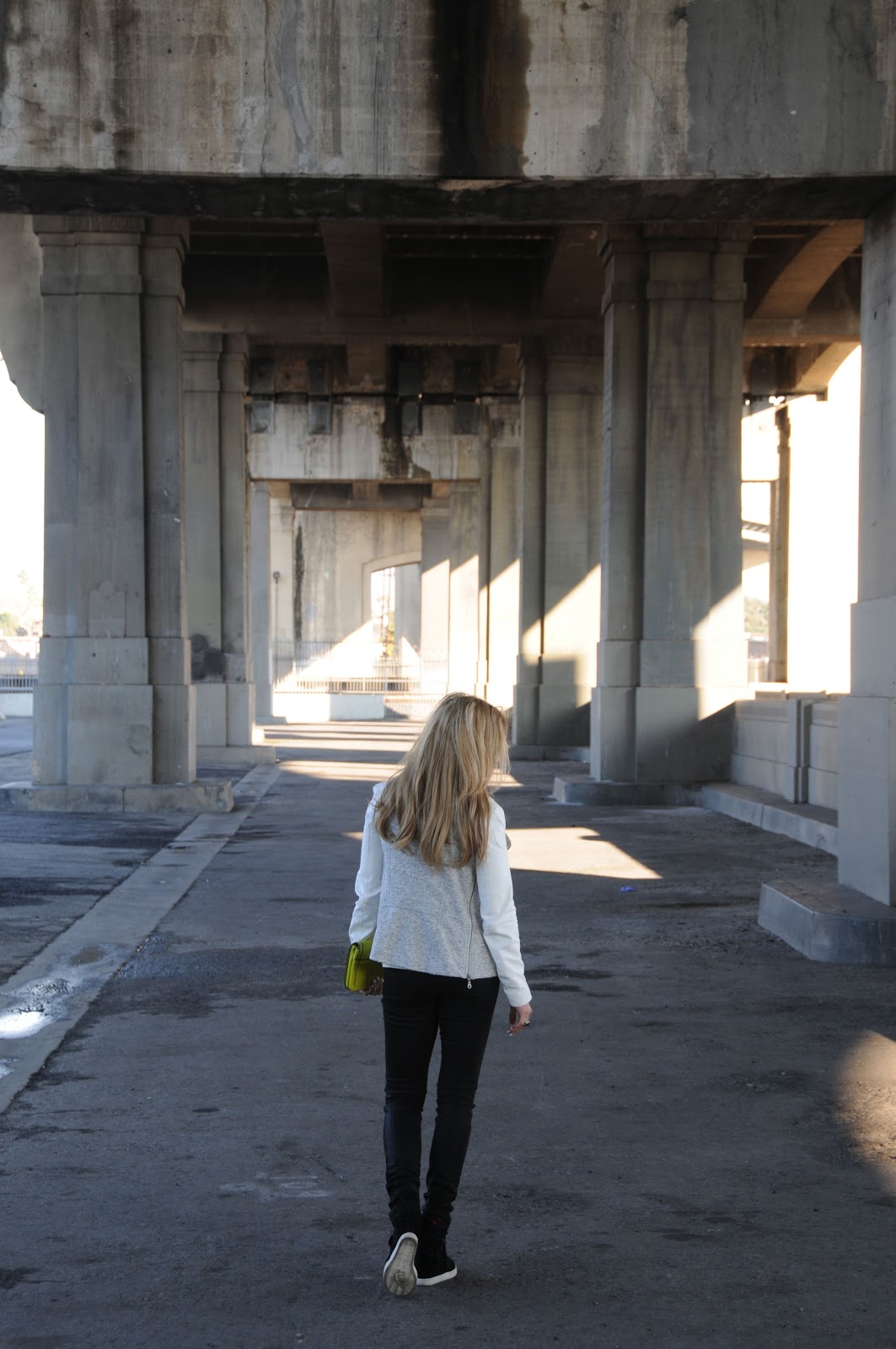 Going through life burning bridges is not fashionable. Rather, keeping your word, laughing often, and treating people with the respect you wish to receive is the mad fabulous way to live. (These pics were taken under a bridge, hence the reference :) In holding true to my word, then, just like I said it would, my affection for leather/pleather has continued to be off the charts. This fall my leather collection grew faster than the Marant Bekkett’s were knocked off. Leather took over my closet, and while I adore each and every piece; it is all in one color; onyx! With Spring fast approaching, though, I have turned the page and taken a shine to lovely leather garments in whites, neutrals, and pastels. Thus far, I don’t see an end in sight, for this irresistible trend, so stay tuned to my blog for more leather/pleather!